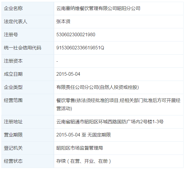 云南塞纳维餐饮管理有限公司昭阳分公司 yztcom 2019-08-11 17:47 关注 云南塞纳维餐饮管理有限公司昭阳分公司 写回答 分享共有1个回答 企信财税 https://www.ubaike.cn/show_7873166.html