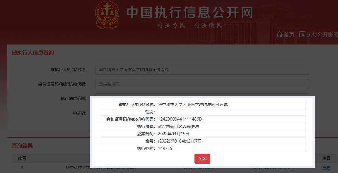 根据中国执行信息披露网,2022年4月15日,华中科技大学同济医学院附属同济医院被列为执行人,执行目标14.97万元。